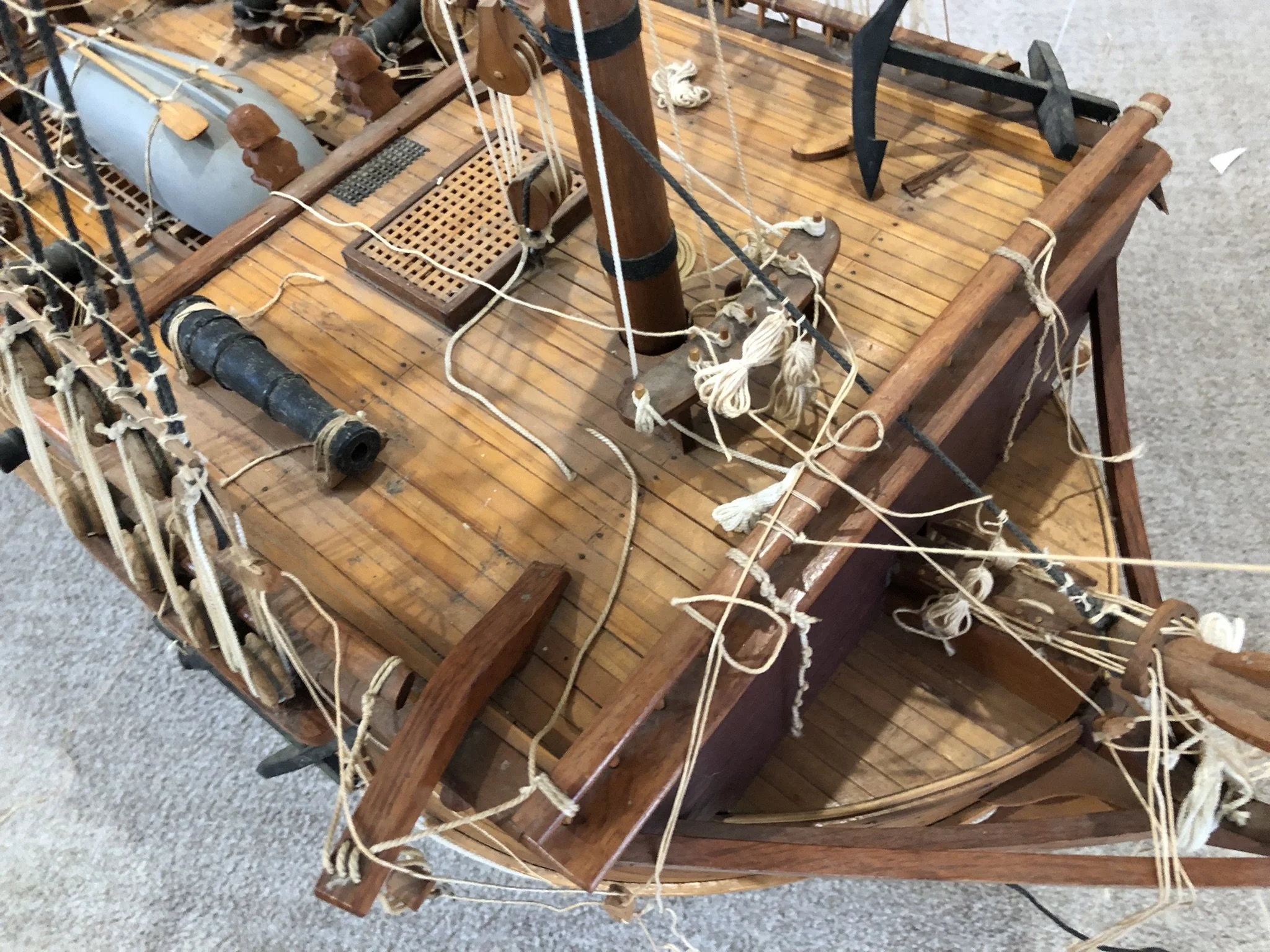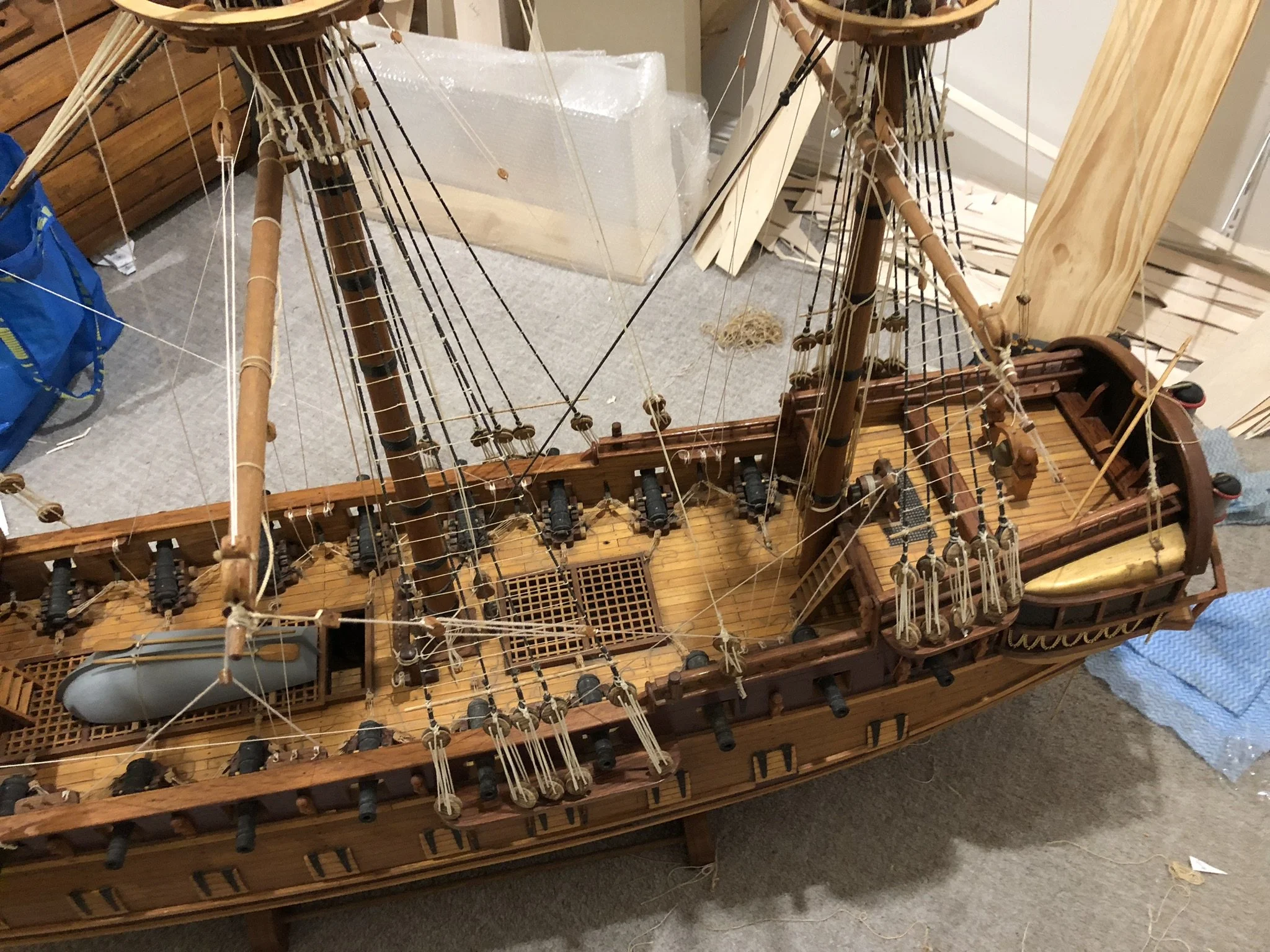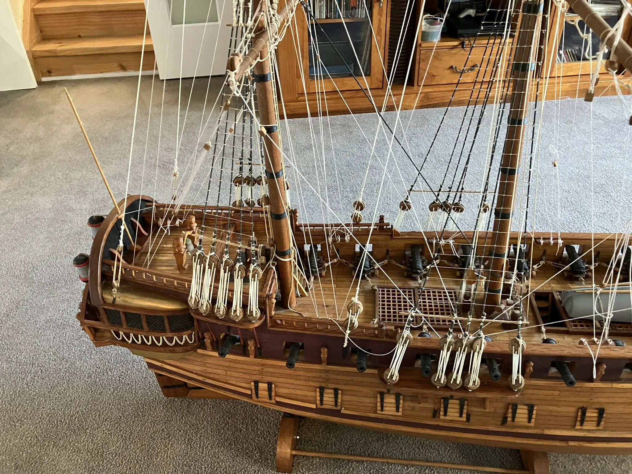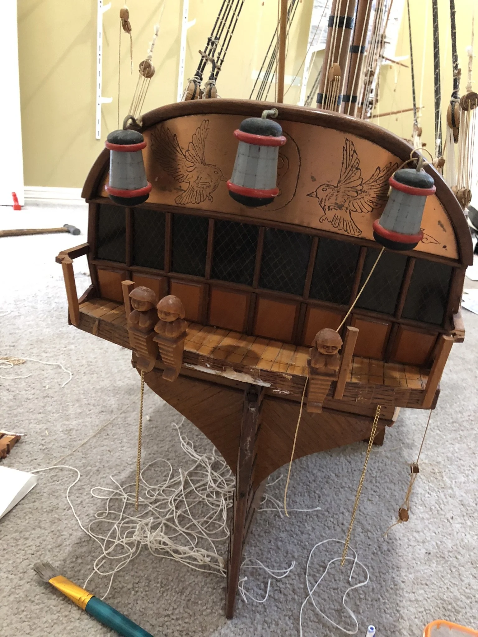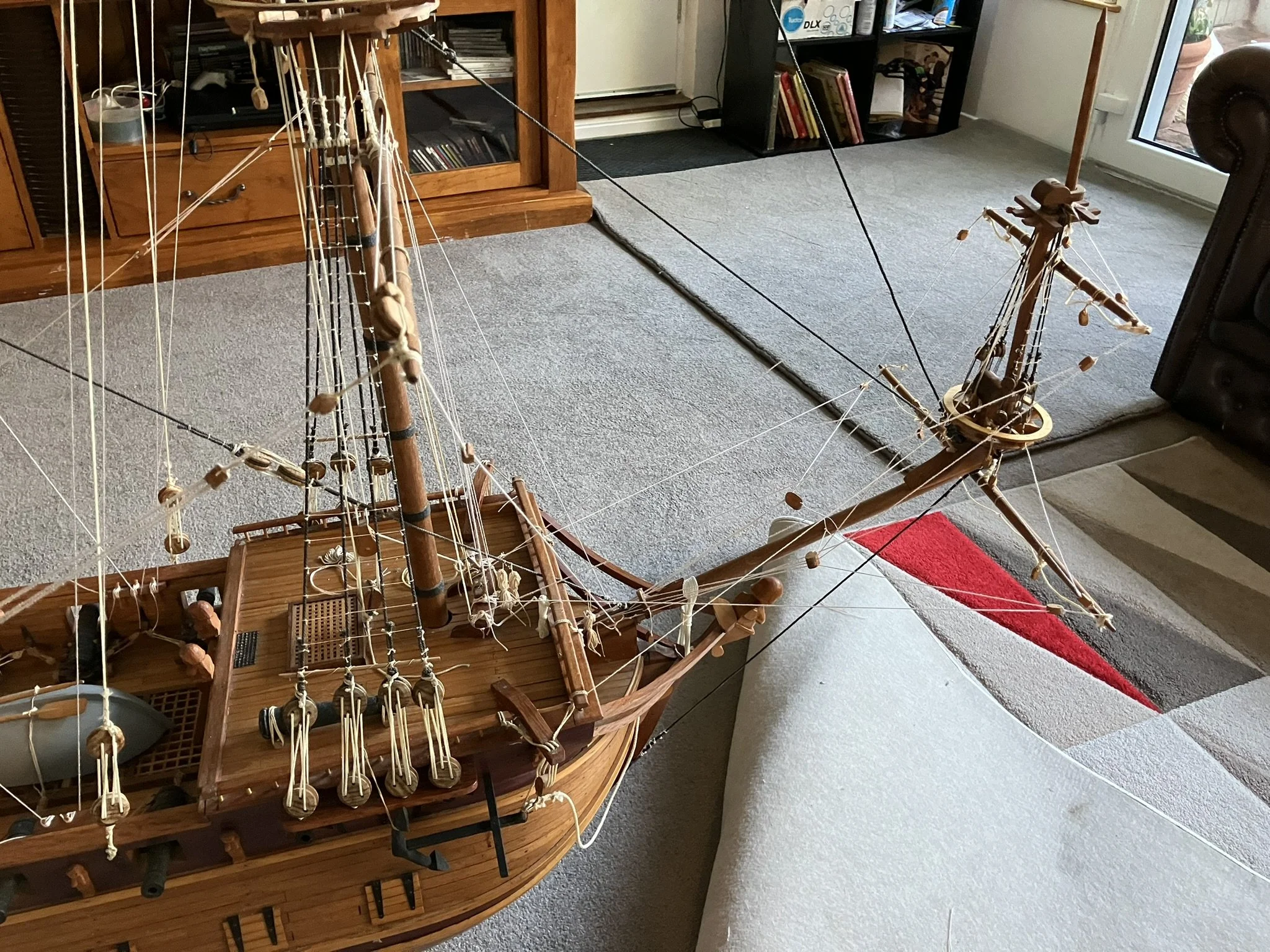 A gentleman approached me after my 2023 exhibition and asked me to repair this enourmous model sailing ship that had been damaged. I thought I was very clever and rfeapired it in my spare room. At least I did until I tried to get it out through the door! I then had to cut the rigging sand turn the yardarms to get it through the various doors. When it was delivered to him I then re-installed the yardarm rigging. The model was very impressive, a huge amount of detail. When I surveyed the model I found that most of the rigging had perished and the bowsprit and associated sails/rigging had been broken off. I also had to fabricate some new carved figurines for the stern walk.