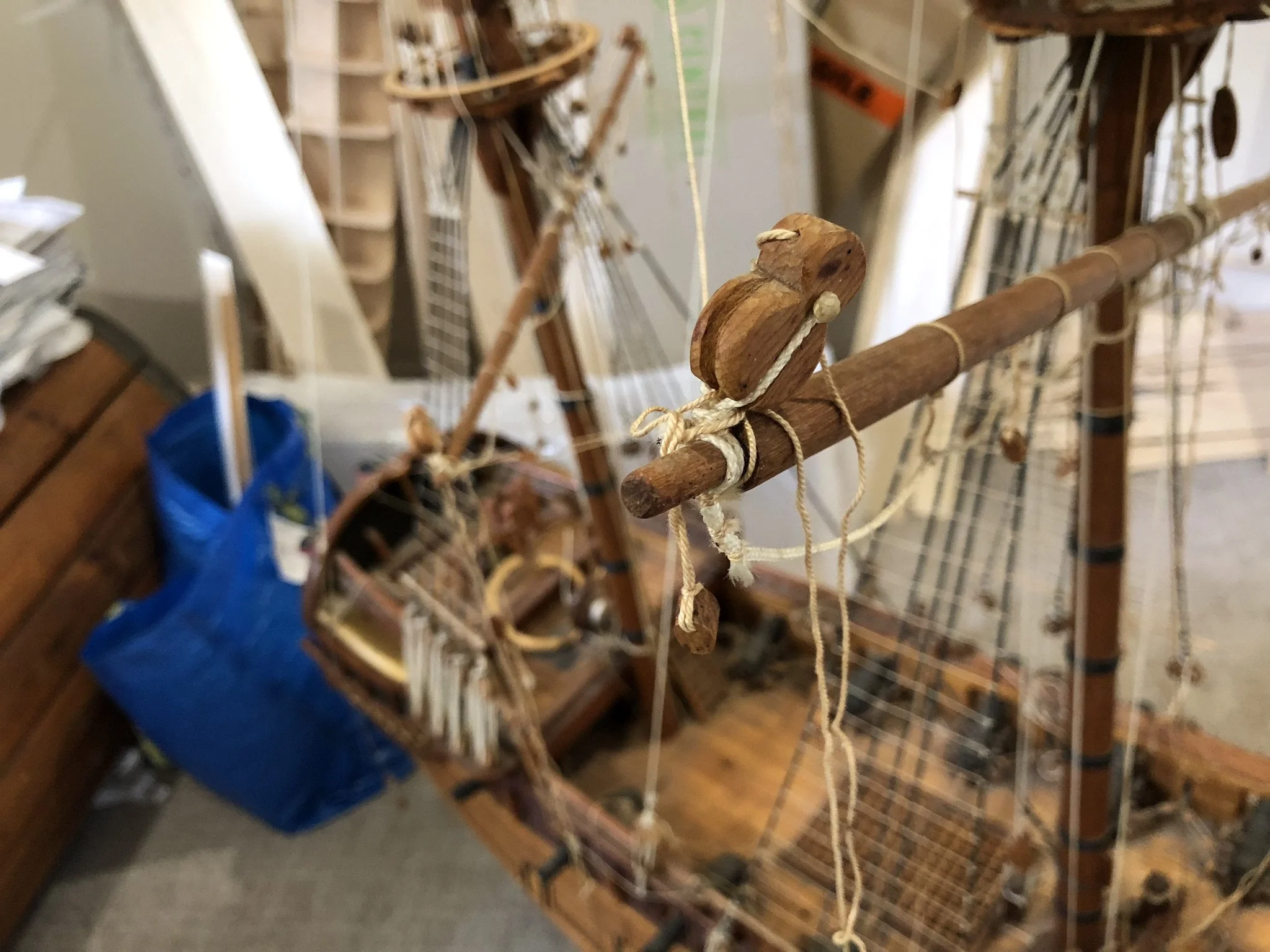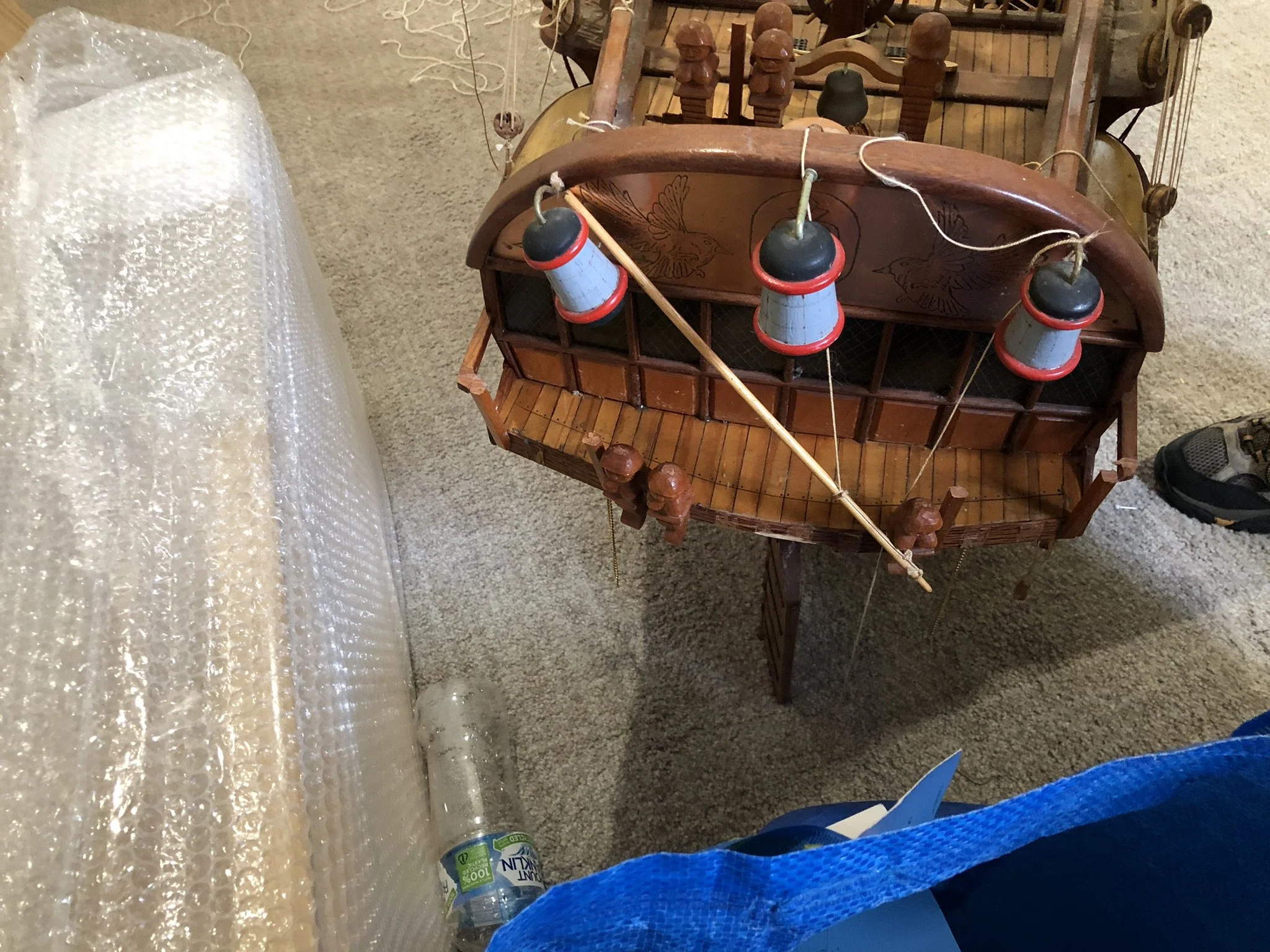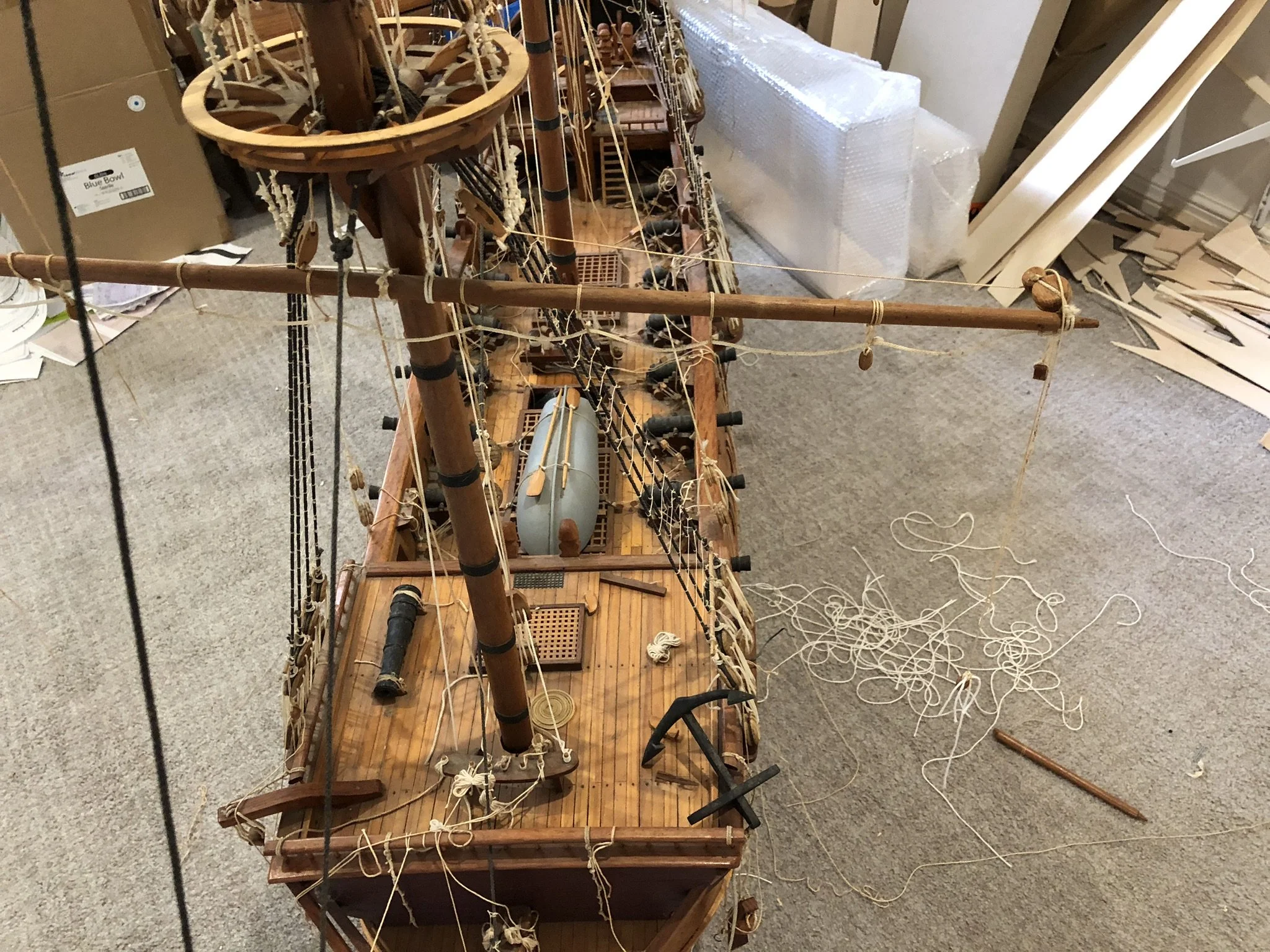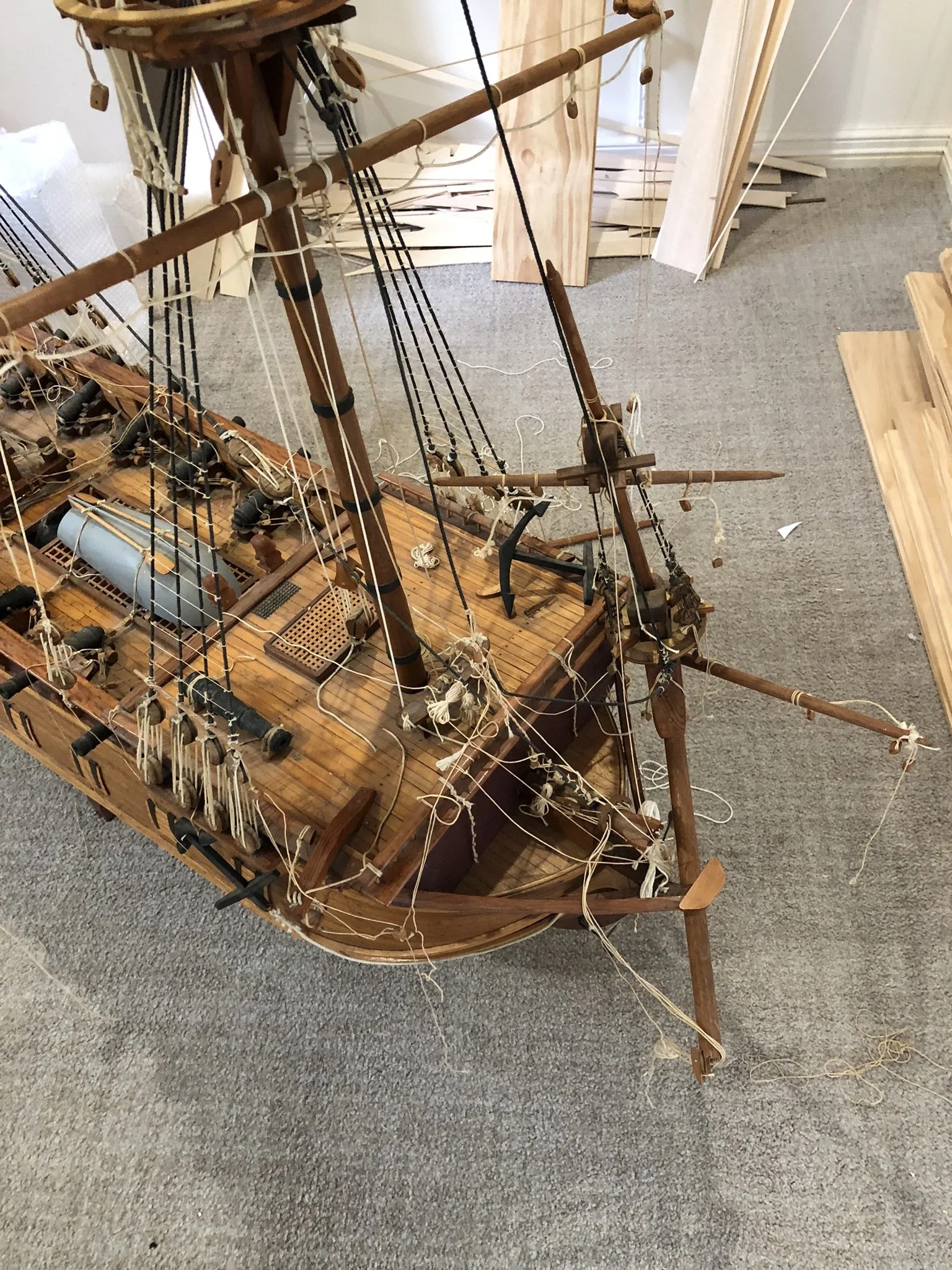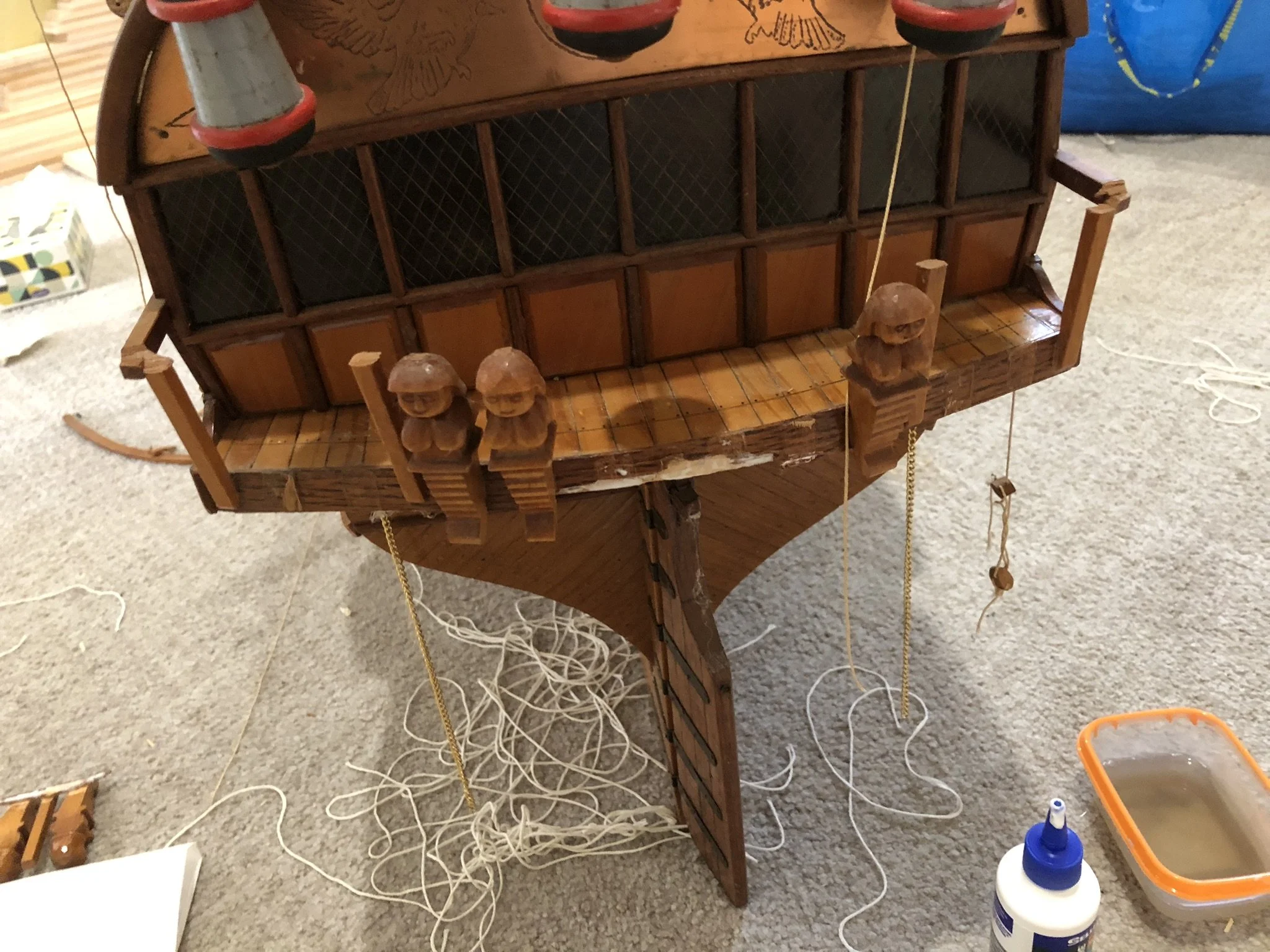 A gentleman approached me after my 2023 exhibition and asked me to repair this enourmous model sailing ship that had been damaged. I thought I was very clever and rfeapired it in my spare room. At least I did until I tried to get it out through the door! I then had to cut the rigging sand turn the yardarms to get it through the various doors. When it was delivered to him I then re-installed the yardarm rigging. The model was very impressive, a huge amount of detail. When I surveyed the model I found that most of the rigging had perished and the bowsprit and associated sails/rigging had been broken off. I also had to fabricate some new carved figurines for the stern walk.