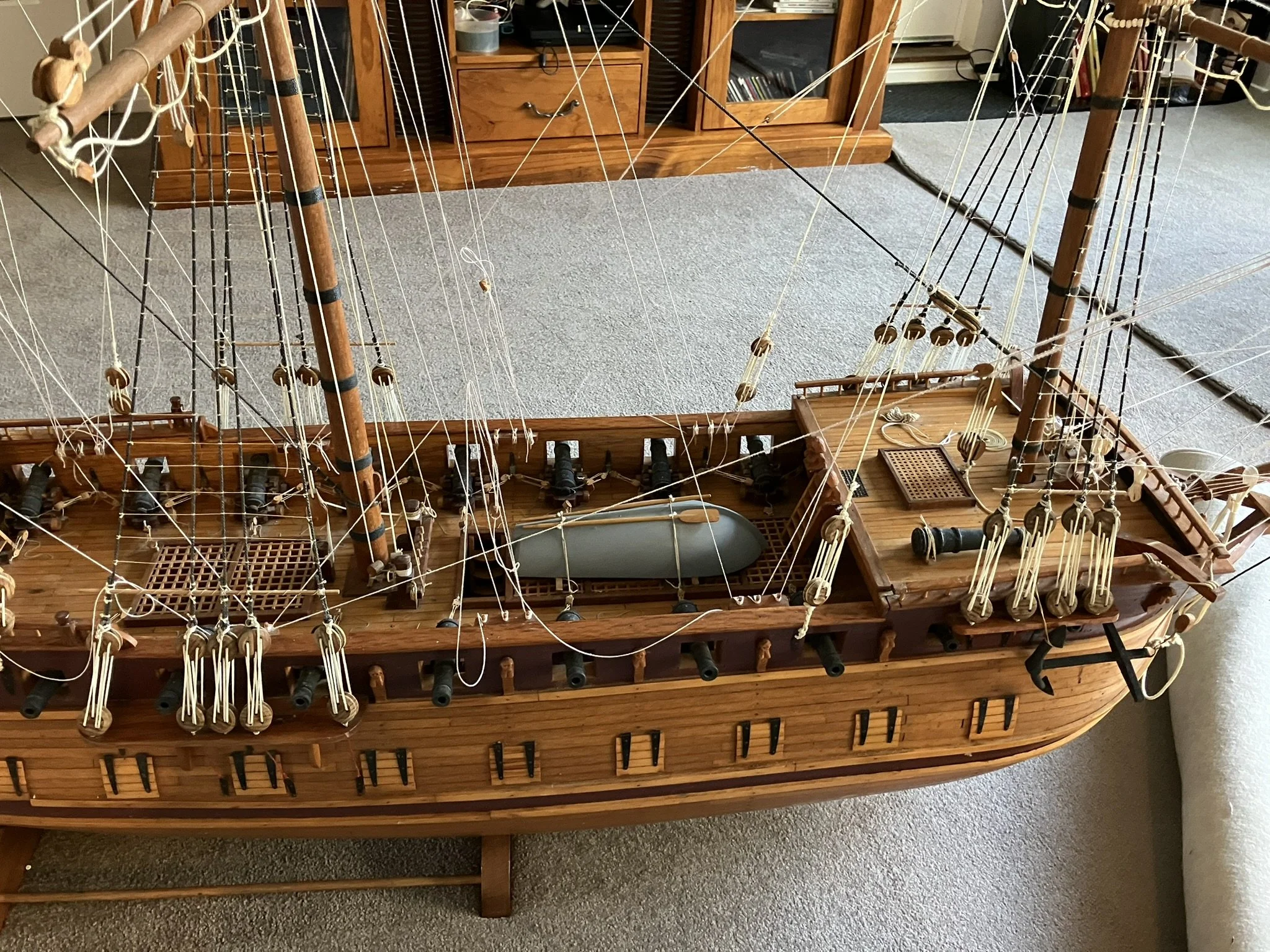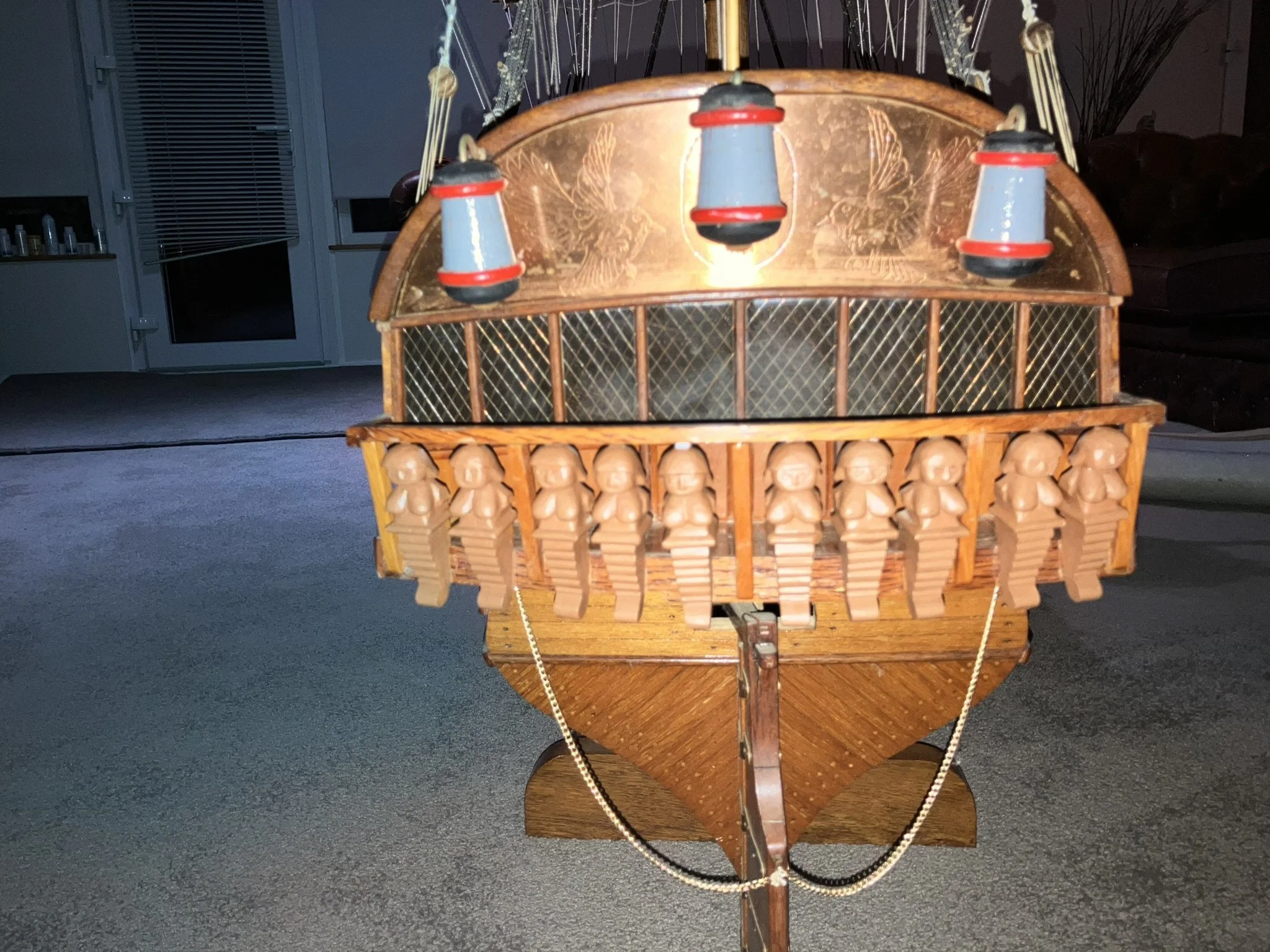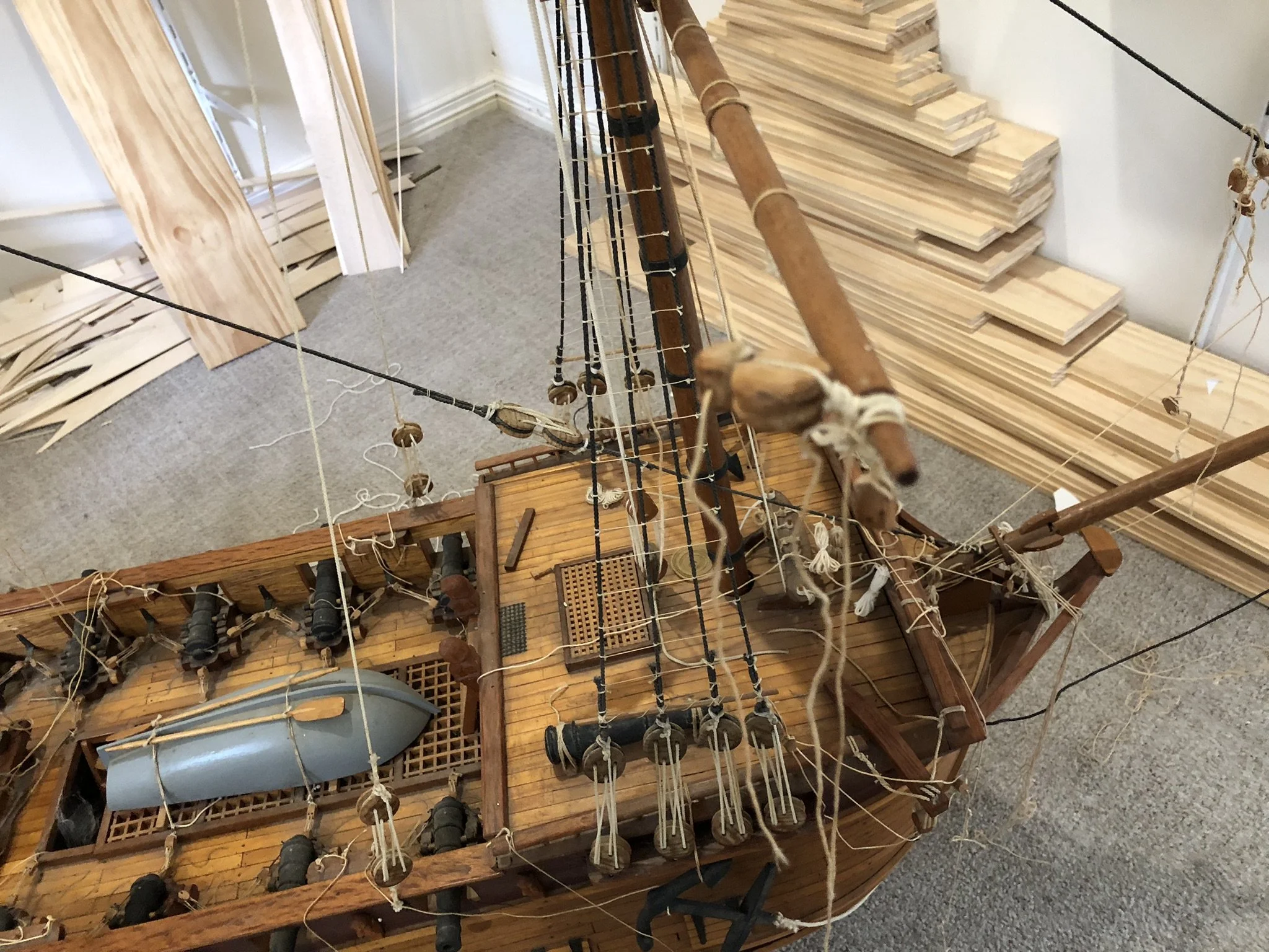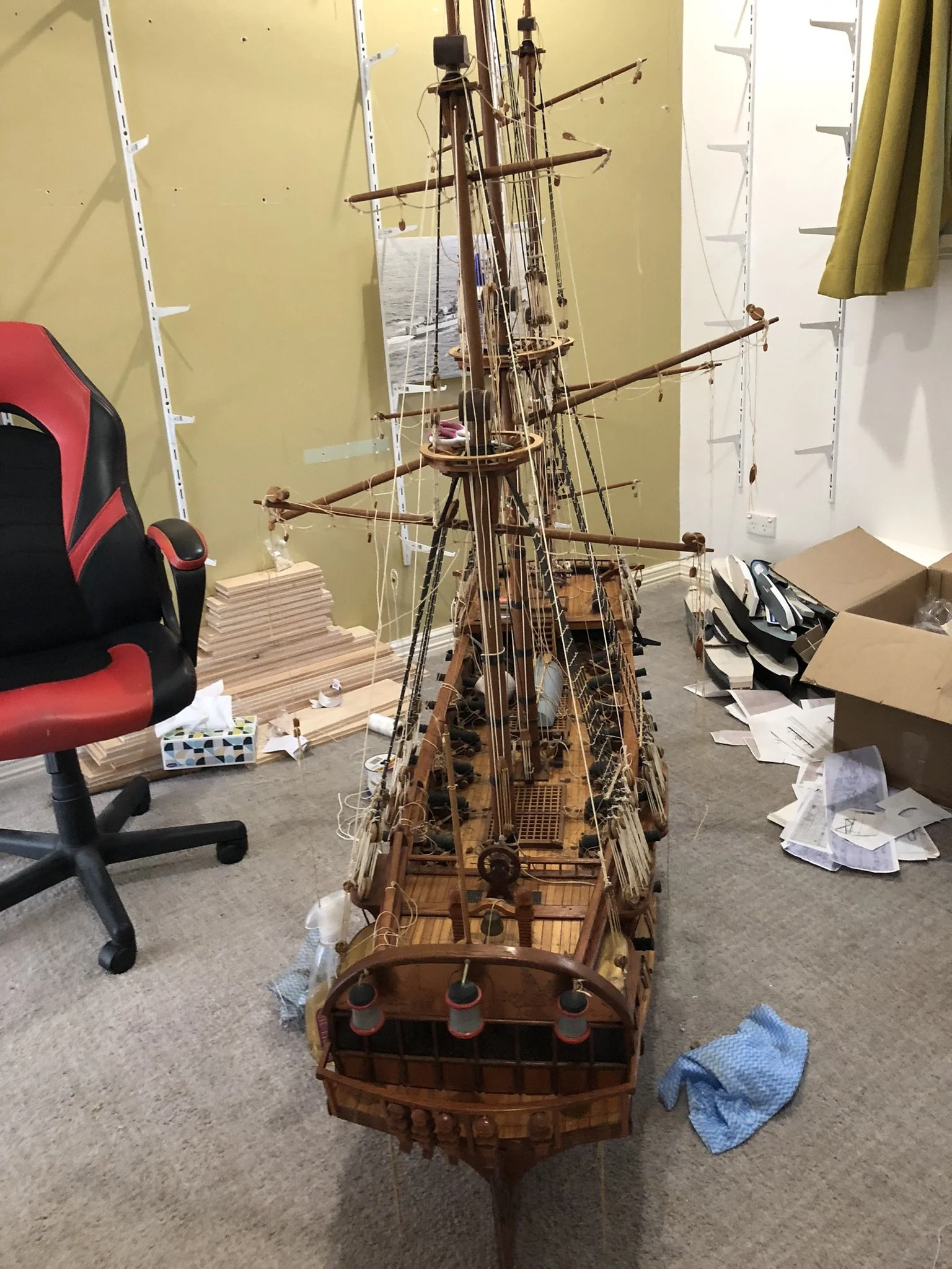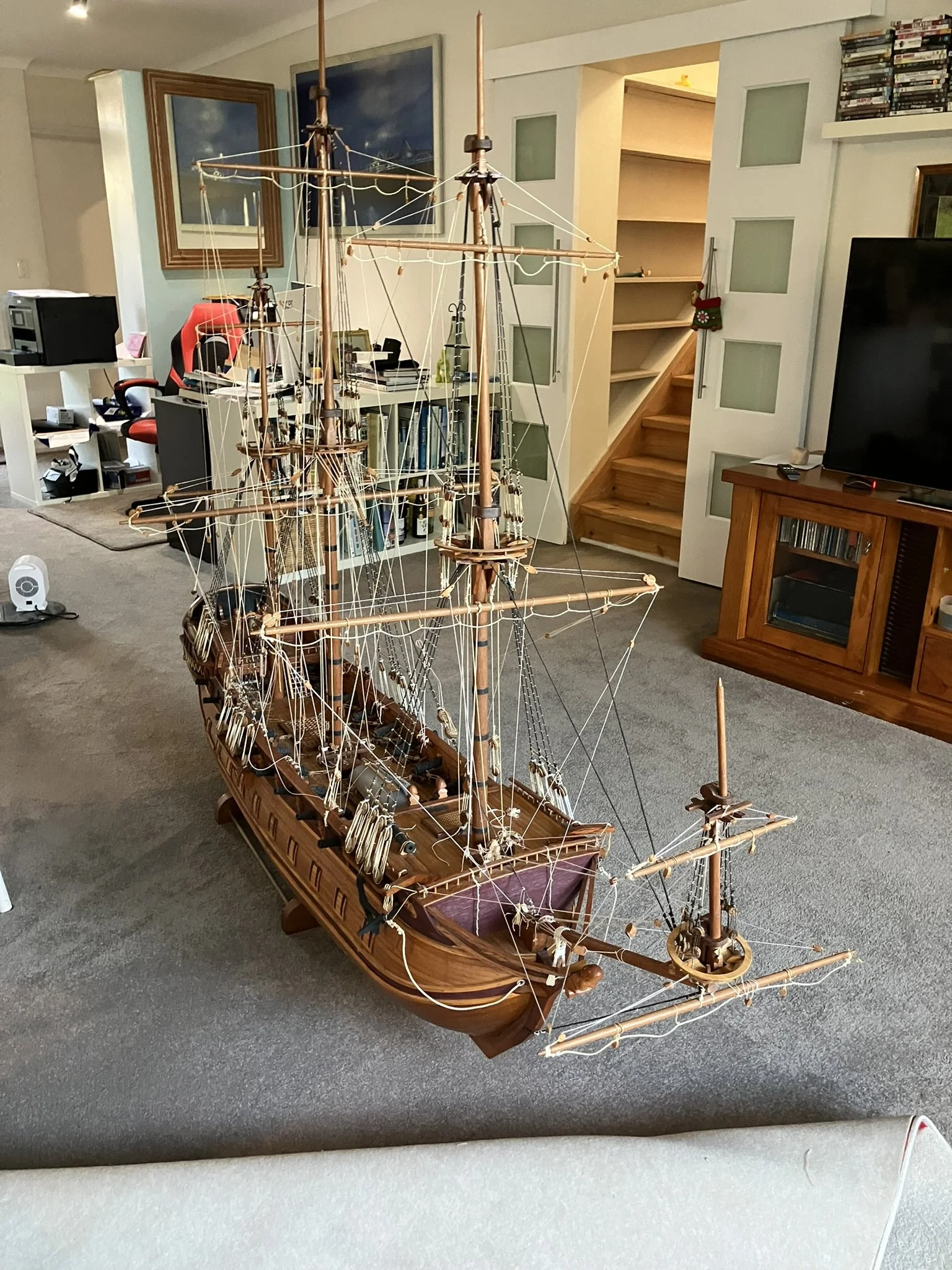 A gentleman approached me after my 2023 exhibition and asked me to repair this enourmous model sailing ship that had been damaged. I thought I was very clever and rfeapired it in my spare room. At least I did until I tried to get it out through the door! I then had to cut the rigging sand turn the yardarms to get it through the various doors. When it was delivered to him I then re-installed the yardarm rigging. The model was very impressive, a huge amount of detail. When I surveyed the model I found that most of the rigging had perished and the bowsprit and associated sails/rigging had been broken off. I also had to fabricate some new carved figurines for the stern walk.