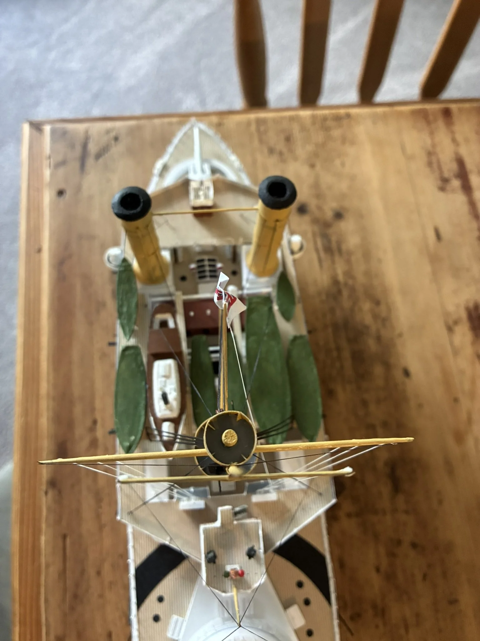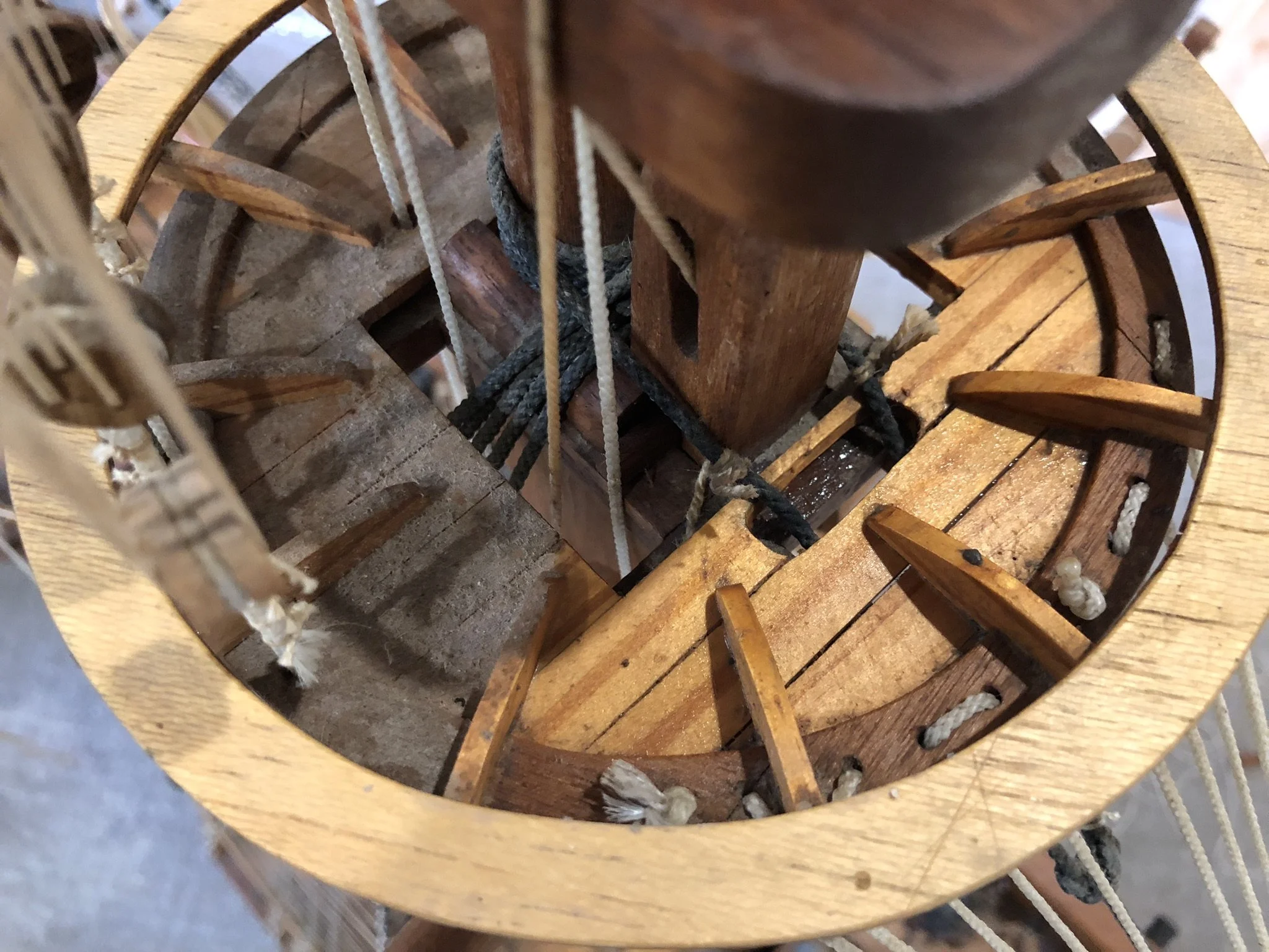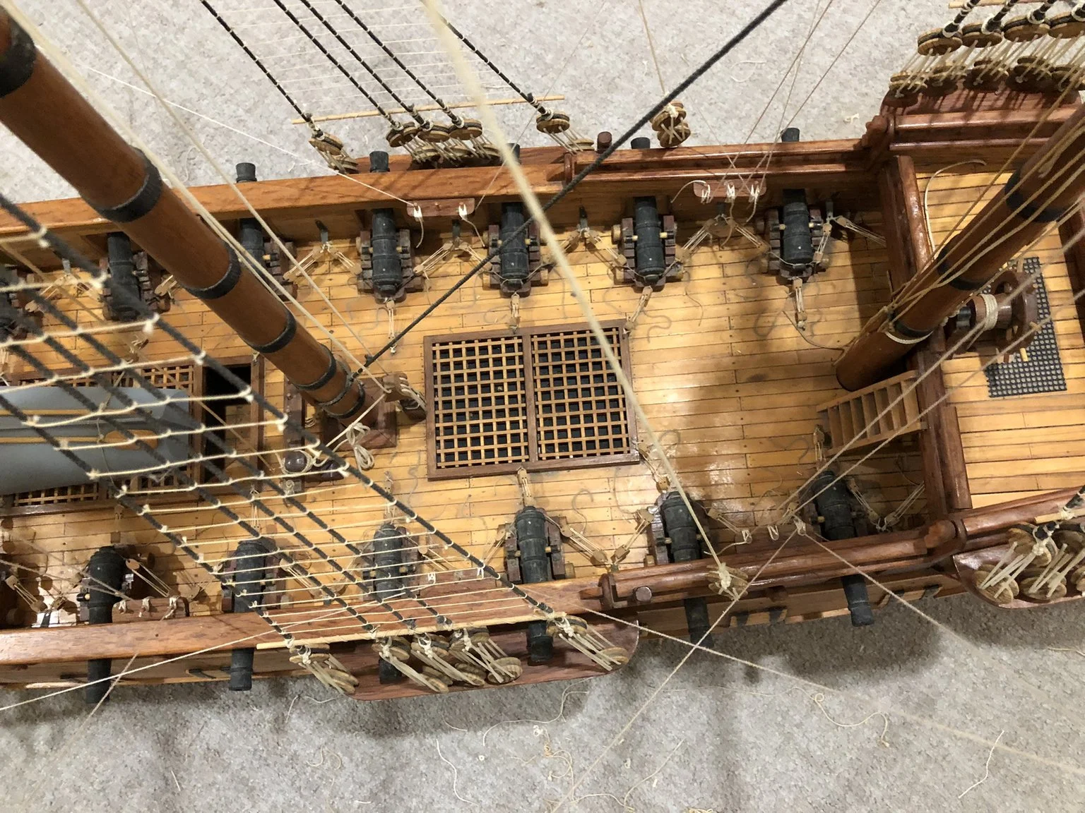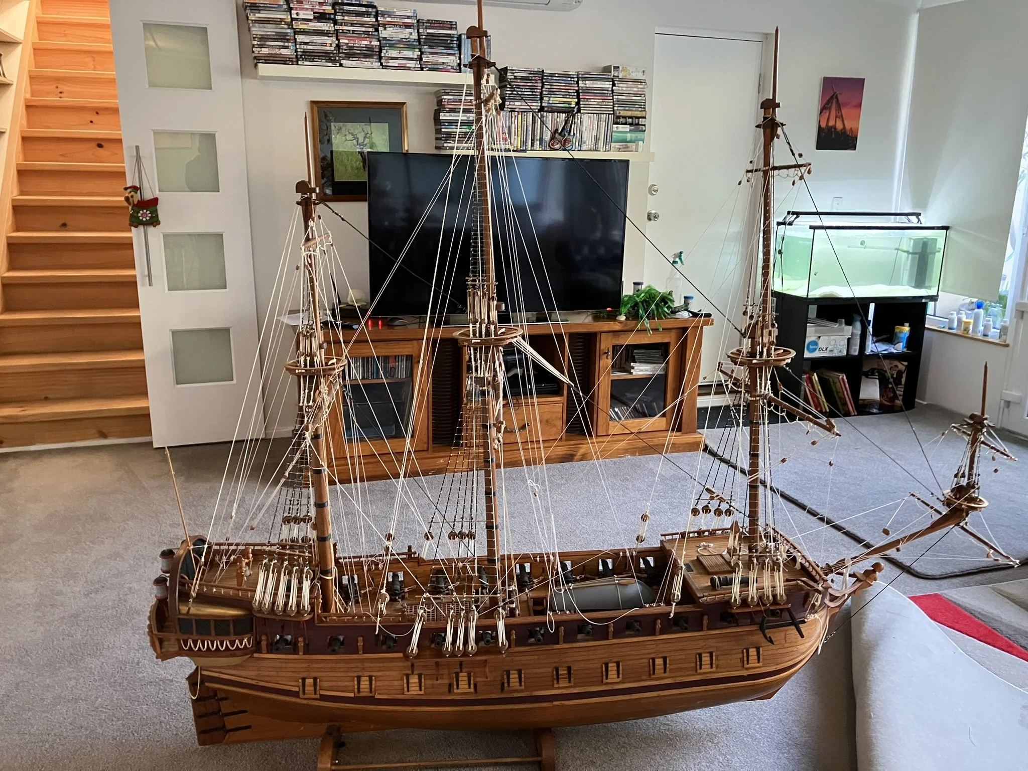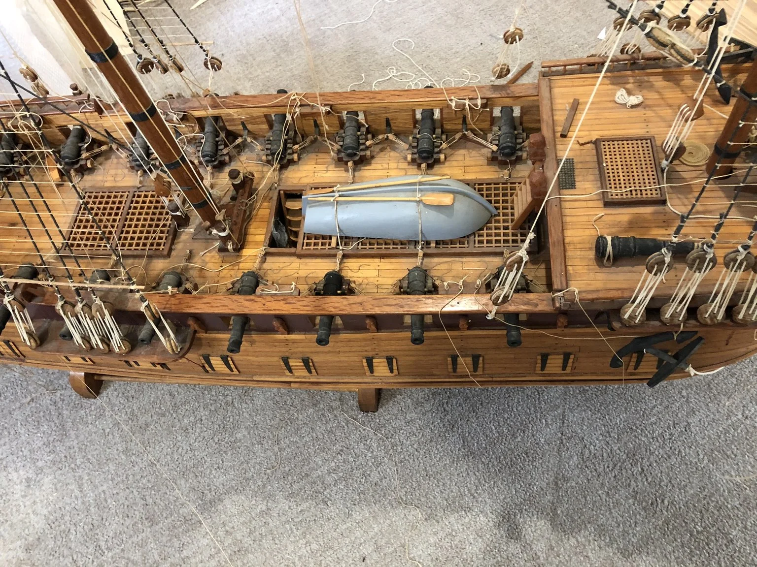 A gentleman approached me after my 2023 exhibition and asked me to repair this enourmous model sailing ship that had been damaged. I thought I was very clever and rfeapired it in my spare room. At least I did until I tried to get it out through the door! I then had to cut the rigging sand turn the yardarms to get it through the various doors. When it was delivered to him I then re-installed the yardarm rigging. The model was very impressive, a huge amount of detail. When I surveyed the model I found that most of the rigging had perished and the bowsprit and associated sails/rigging had been broken off. I also had to fabricate some new carved figurines for the stern walk.