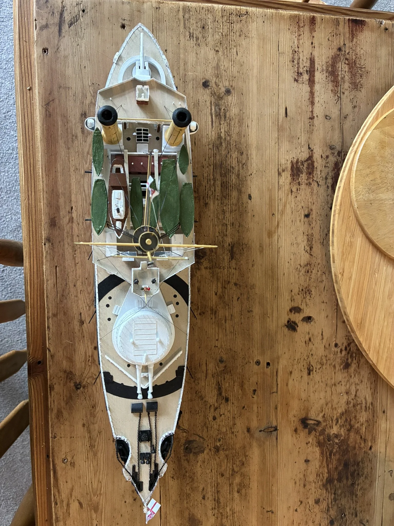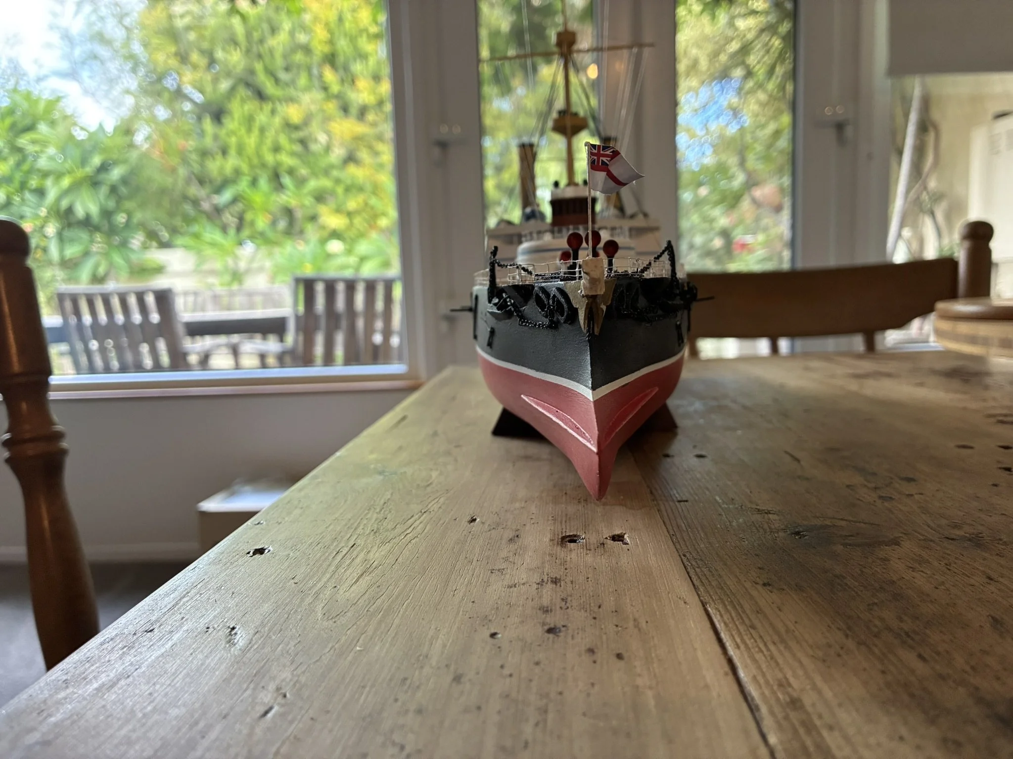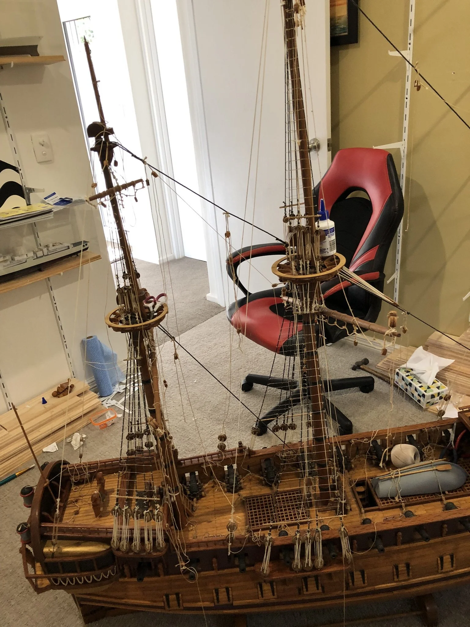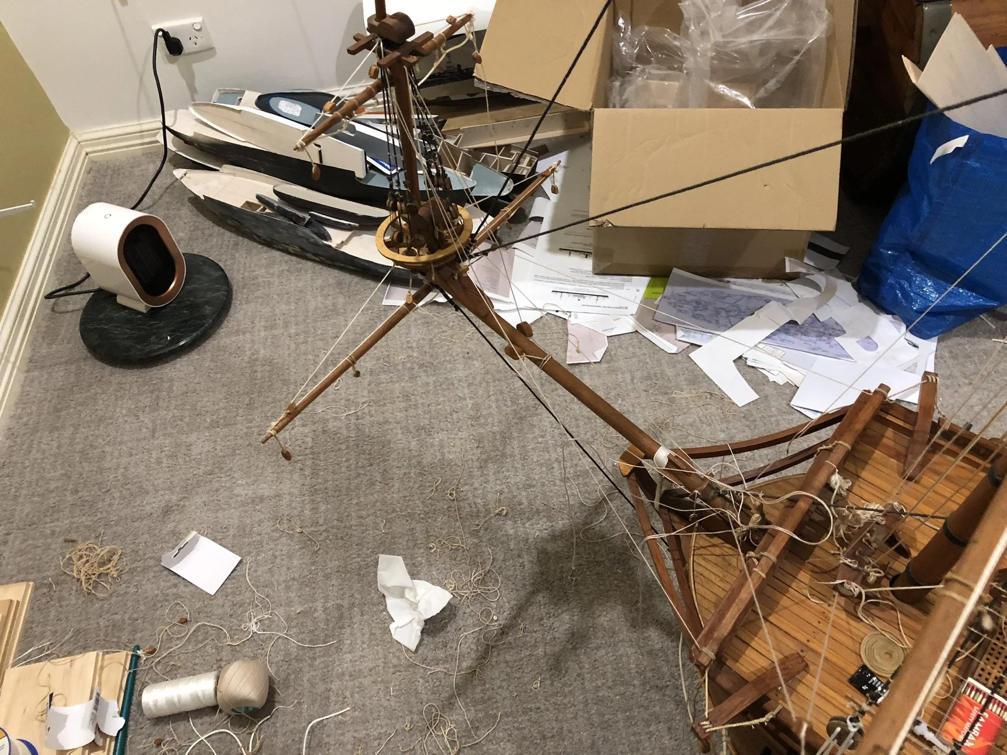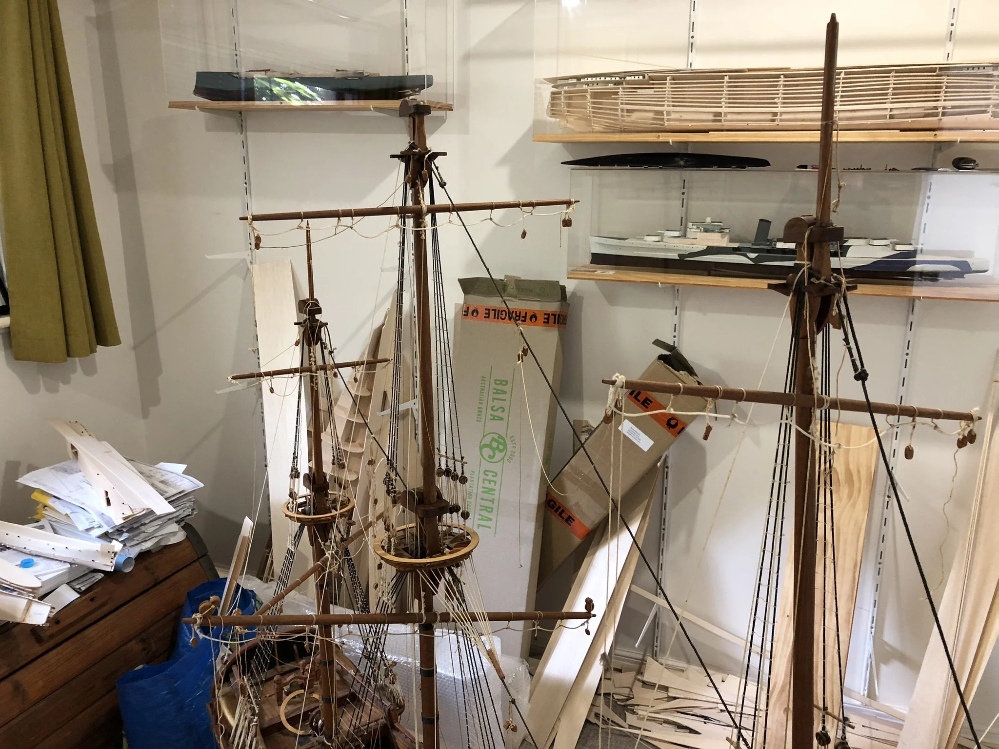 A gentleman approached me after my 2023 exhibition and asked me to repair this enourmous model sailing ship that had been damaged. I thought I was very clever and rfeapired it in my spare room. At least I did until I tried to get it out through the door! I then had to cut the rigging sand turn the yardarms to get it through the various doors. When it was delivered to him I then re-installed the yardarm rigging. The model was very impressive, a huge amount of detail. When I surveyed the model I found that most of the rigging had perished and the bowsprit and associated sails/rigging had been broken off. I also had to fabricate some new carved figurines for the stern walk.