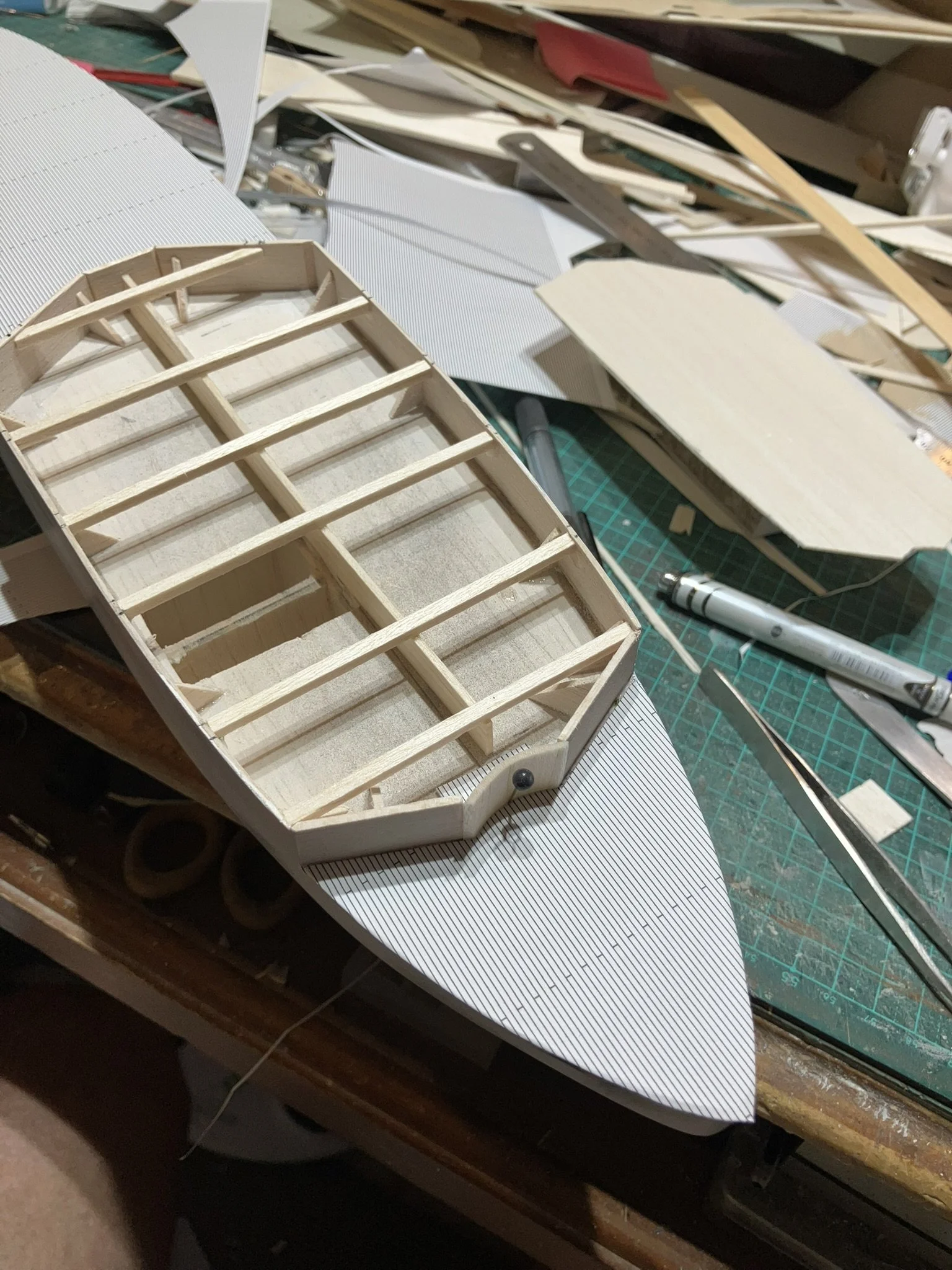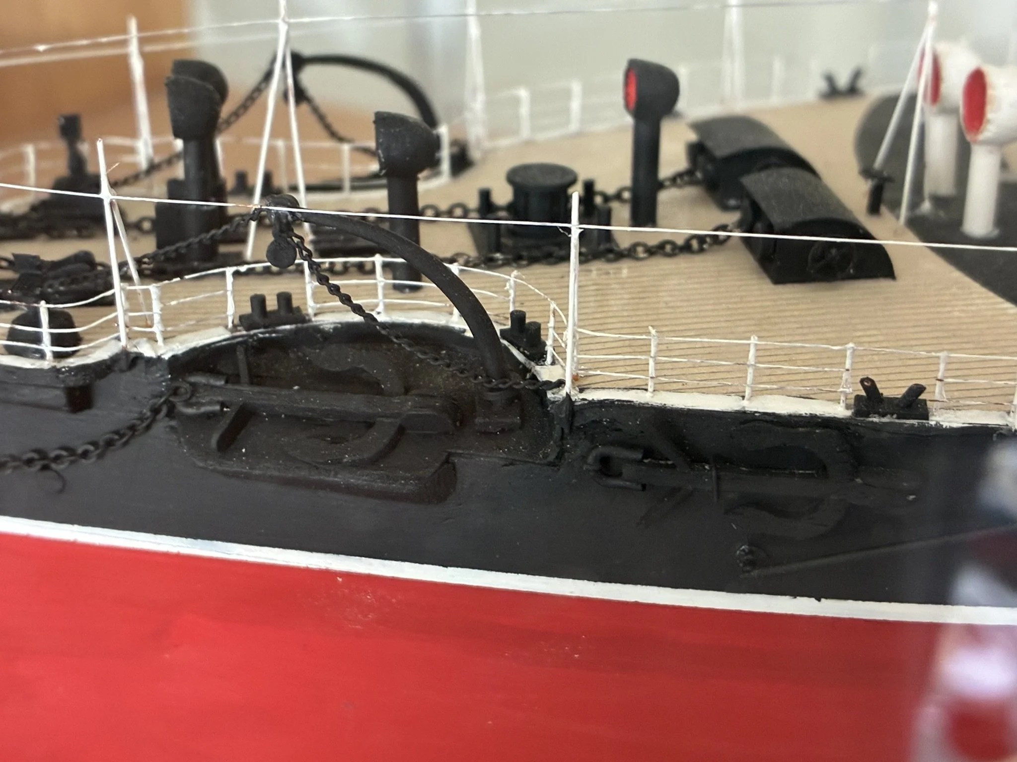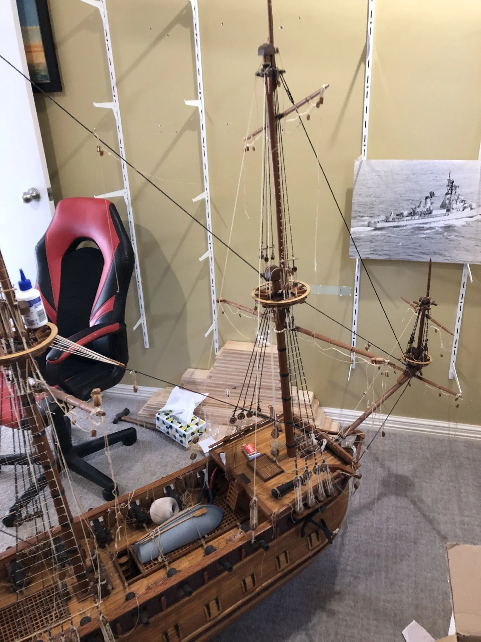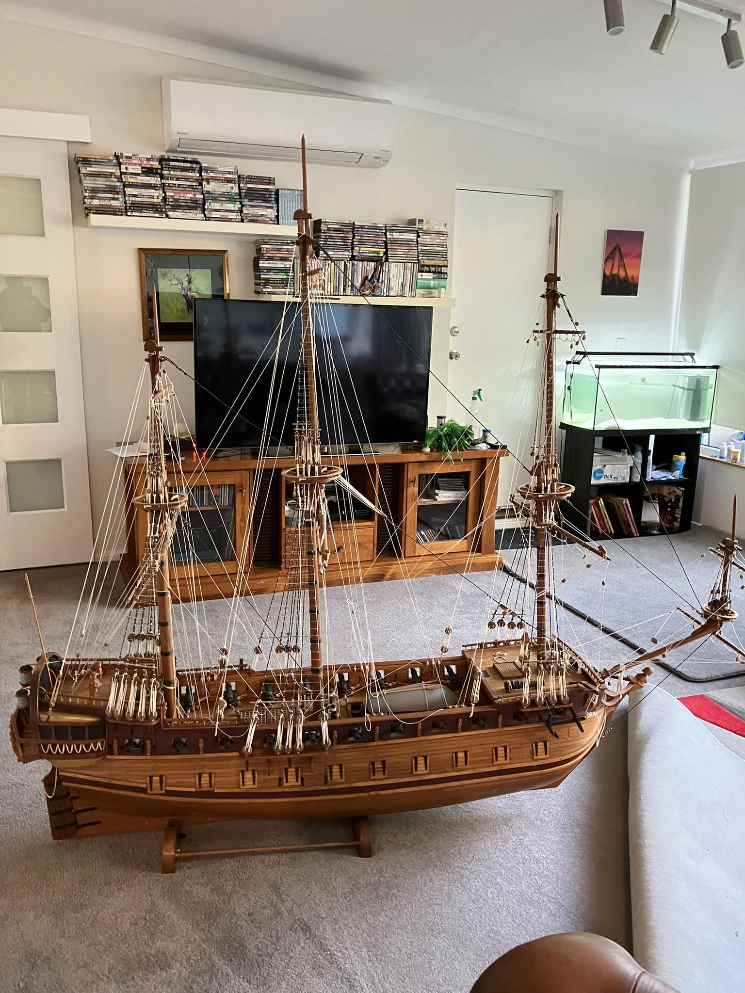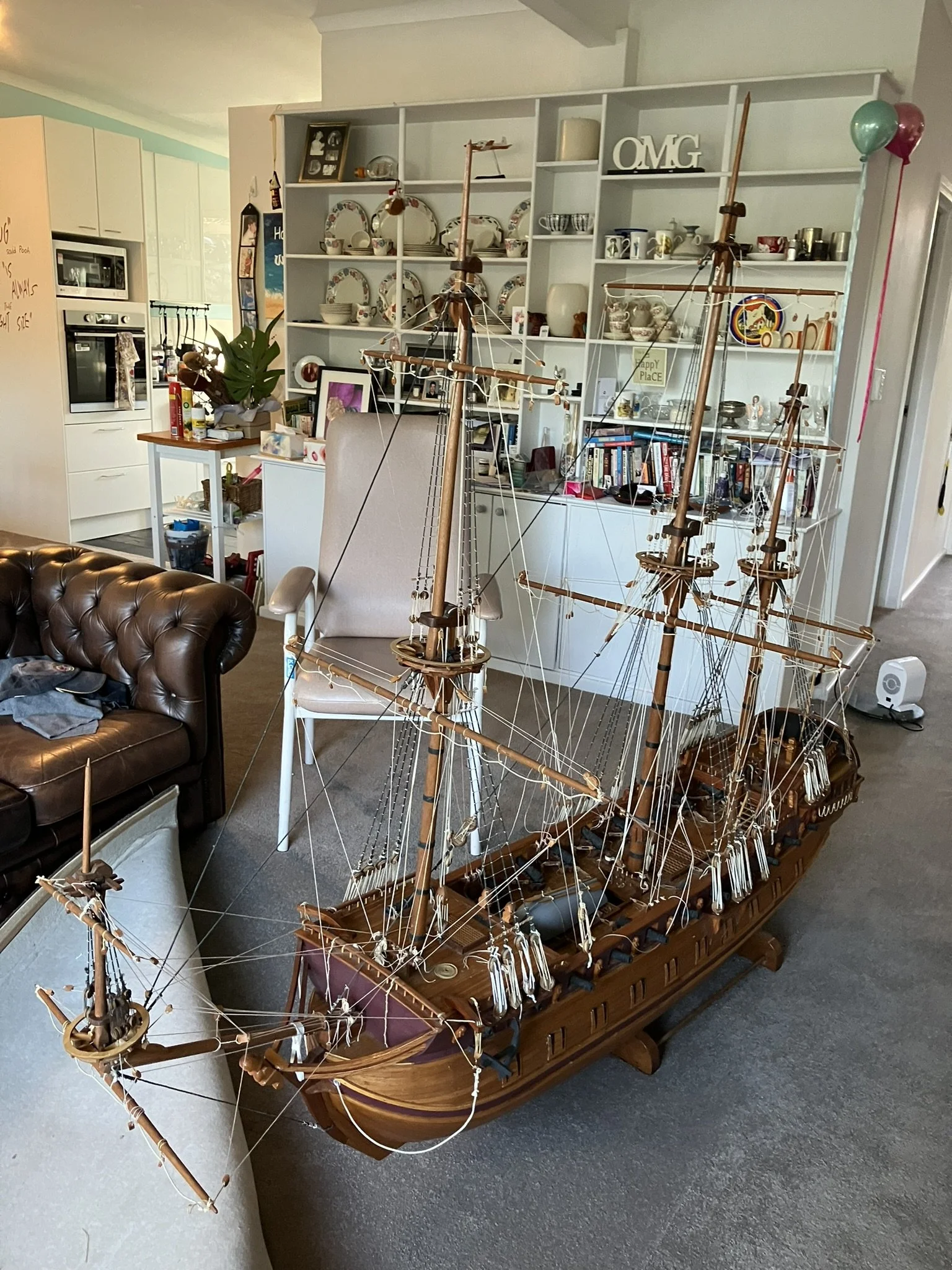 A gentleman approached me after my 2023 exhibition and asked me to repair this enourmous model sailing ship that had been damaged. I thought I was very clever and rfeapired it in my spare room. At least I did until I tried to get it out through the door! I then had to cut the rigging sand turn the yardarms to get it through the various doors. When it was delivered to him I then re-installed the yardarm rigging. The model was very impressive, a huge amount of detail. When I surveyed the model I found that most of the rigging had perished and the bowsprit and associated sails/rigging had been broken off. I also had to fabricate some new carved figurines for the stern walk.