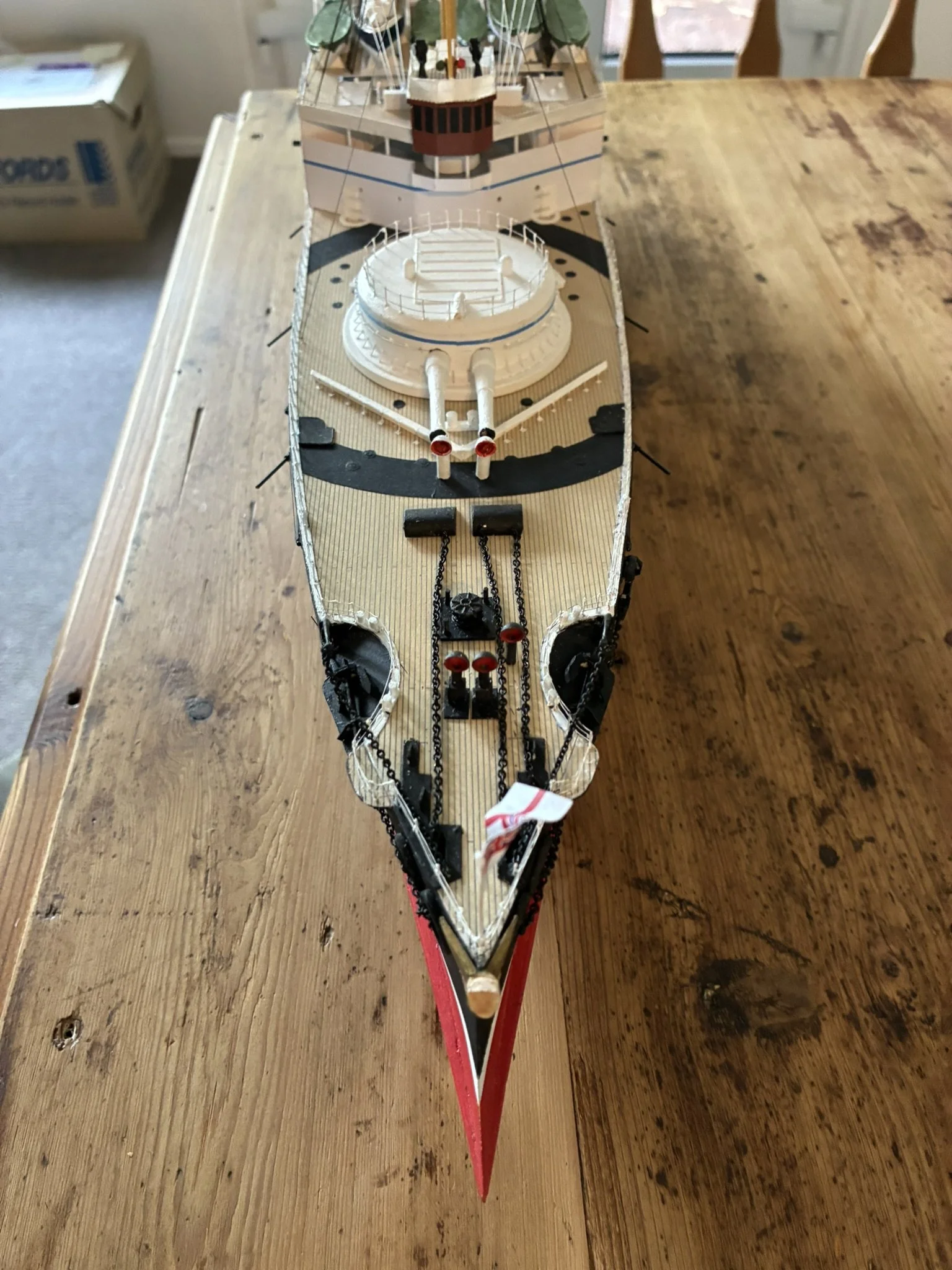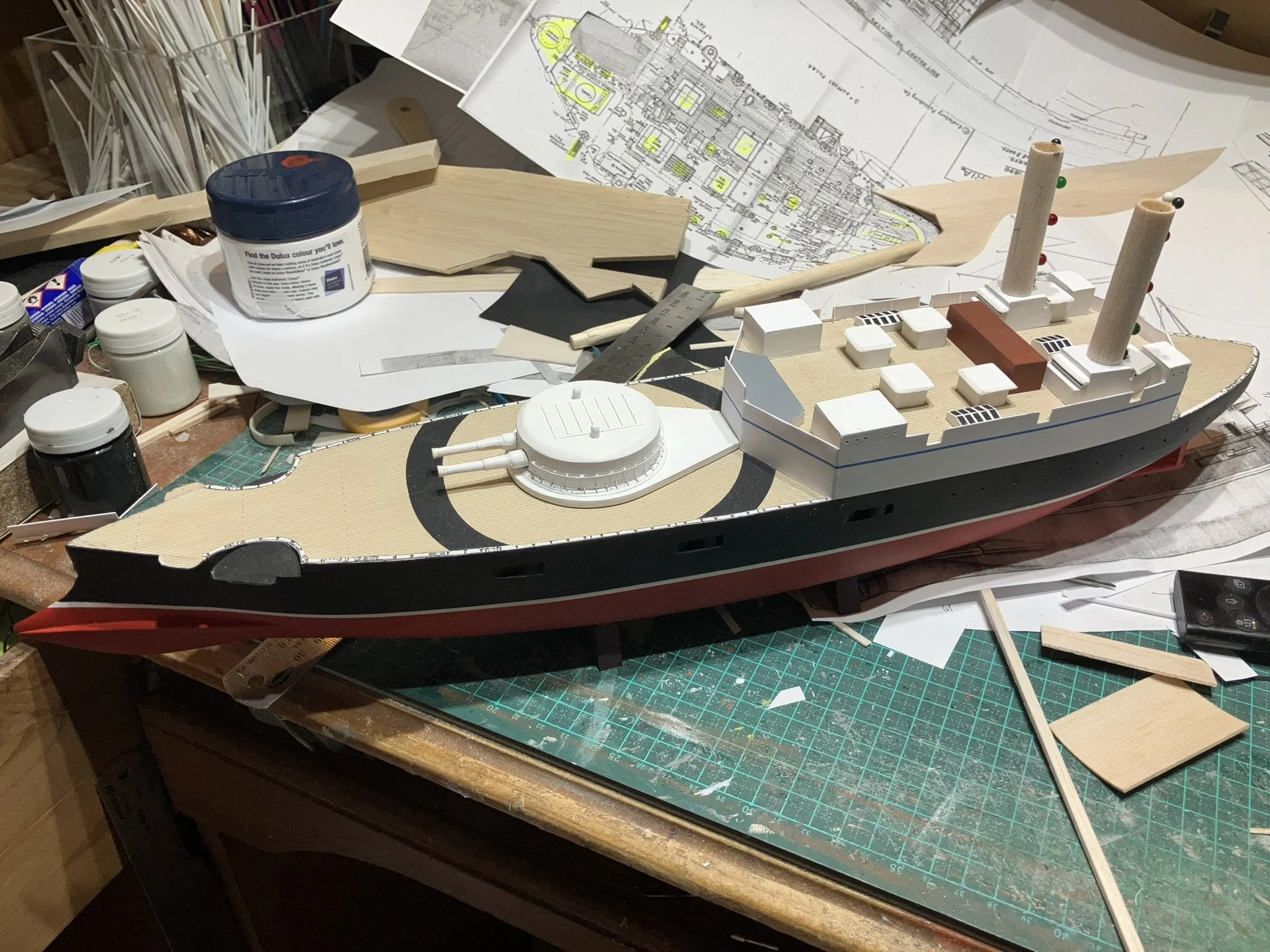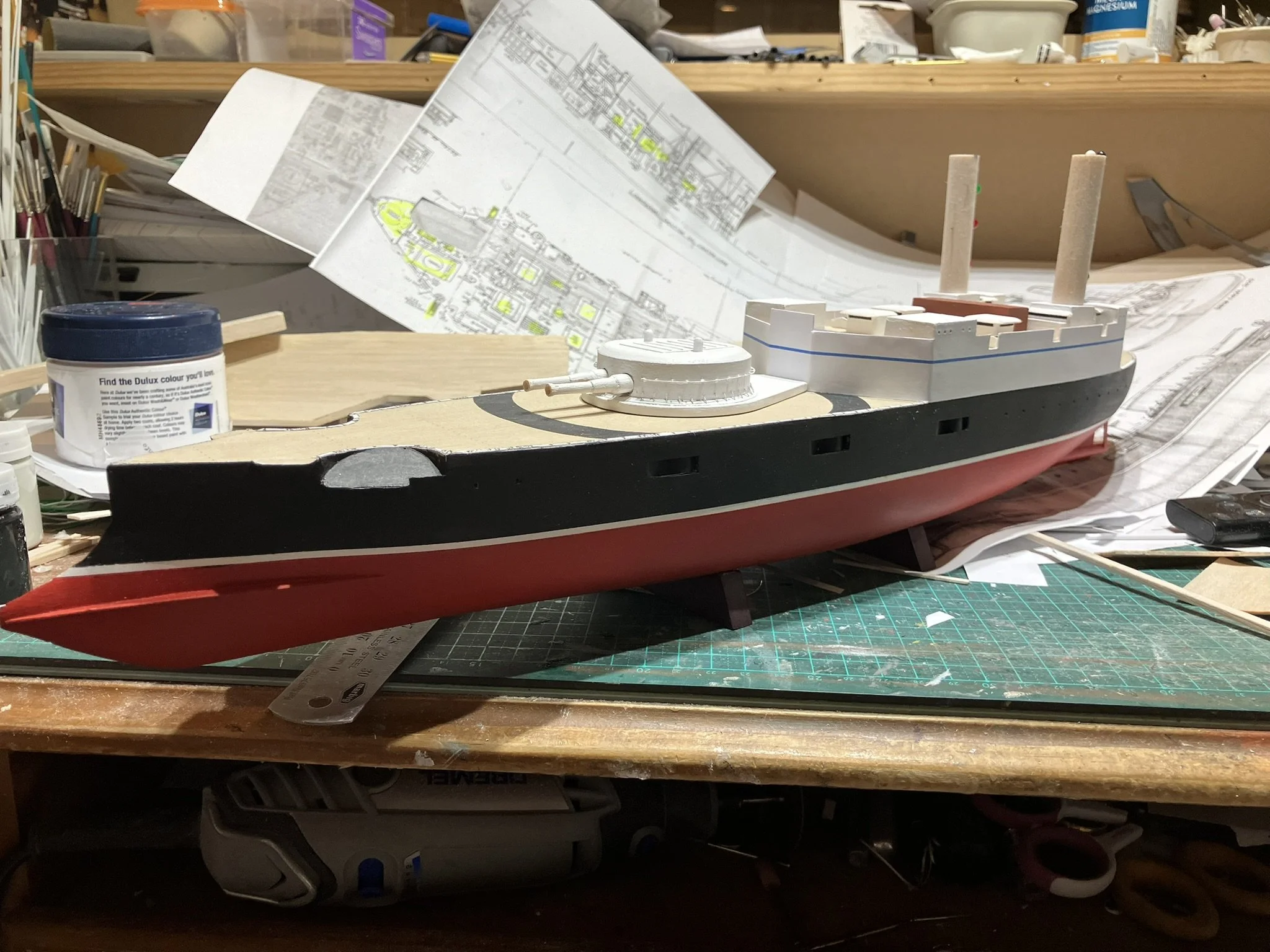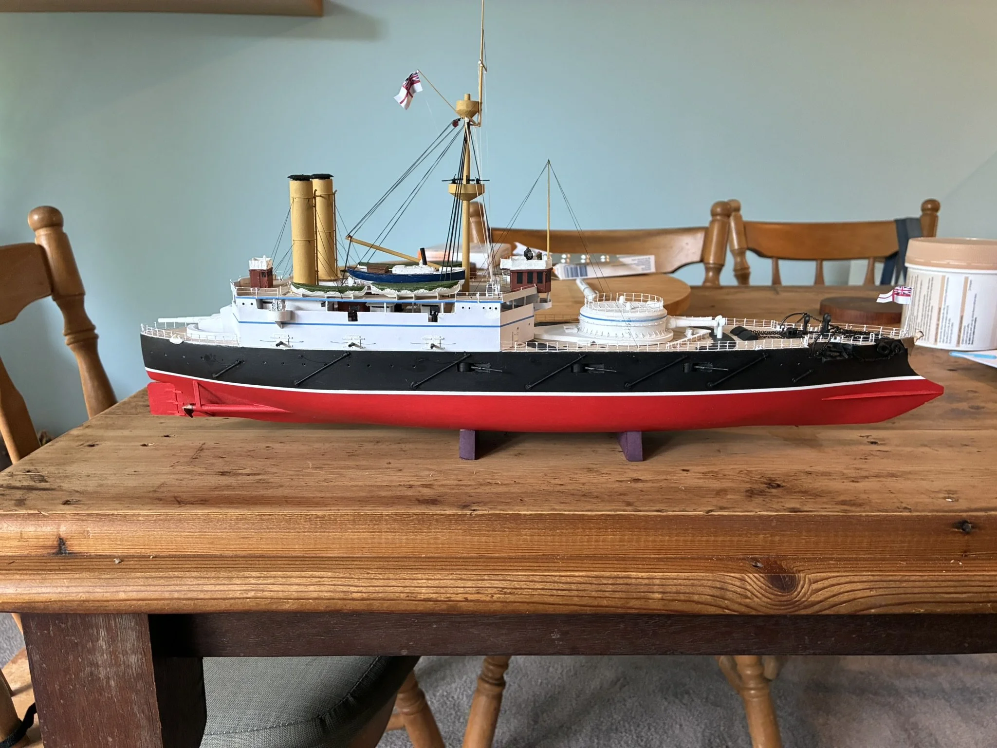 Thunderchild from H.G Wells’ “War of the World”. I built this for Drachinefel to my common scale 0f 1/192. The model was based on drawings that Drachinefel provided as a starting point. I then used the plans that I have of HMS Victoria as the main design for Thunderchild. I must say that building a “What if” is more challenging than an actual real life ship. I did like her final appearance and Drachinefel was very happy with my rendering. Getting it to the UK is another story!! An exercise in “thinking outside the box”!