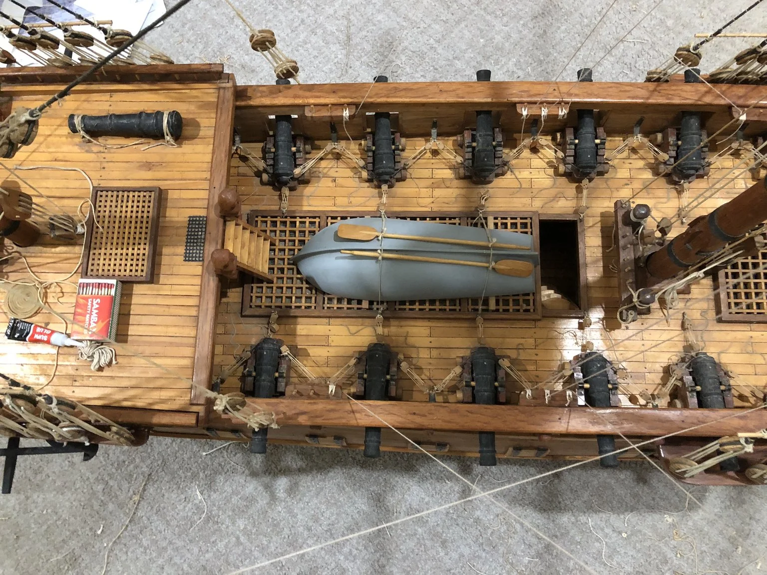 This model had been badly damaged during transport. Most of the masts/yardarms were really in poor condition and couldn’t be saved. Fortunately the sails were still in good condition.